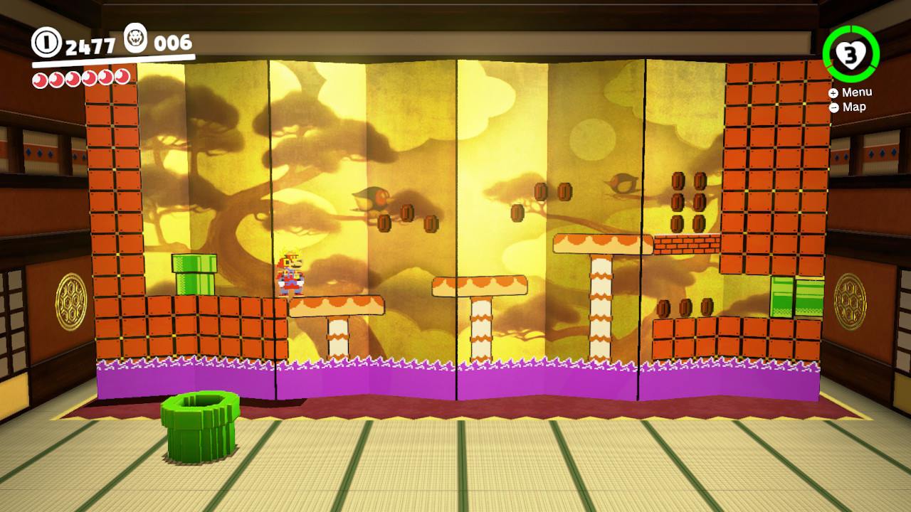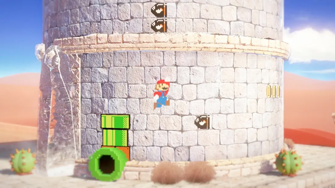 Une autre très bonne idée qui est présente dans cet épisode de Super Mario c'est les nombreux passages en 2D (en 2 dimensions c'est-à-dire qu'ils n'ont pas de profondeur et donnent ainsi l'impression d'être à plat) qui sont très bien intégrés dans un environnement en 3D (en 3 dimensions c'est-à-dire avec de la profondeur). Ces passages qui rappellent les anciens Mario ne sont pas uniquement un clin d'œil plein d'affection aux anciens titres de la licence. Ils sont aussi une manière astucieuse de créer de nouveaux level designs [ conceptions de niveau ] en jouant avec la combinaison de possiblités offertes par un environnement en 2D et en 3D.